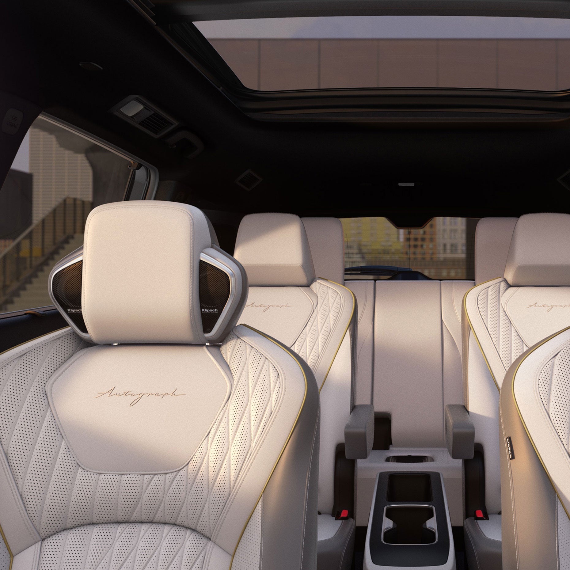 - Quilted semi-aniline leather-appointed first-and-second-row seating with contrast stitching and massaging first-row seating