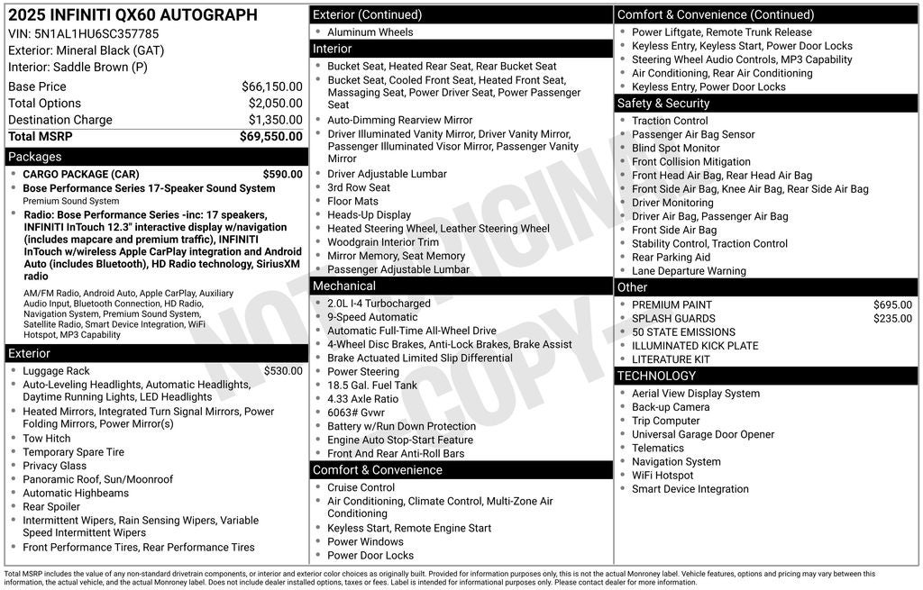Bruce Bennett Nissan INFINITI of Danbury is proud to present you with another True Market Priced Vehicle. This 2025 INFINITI QX60 Autograph is loaded with the following Factory Options: Cargo Package, 17 Speakers, 3rd row seats: bench, 4-Wheel Disc Brakes, ABS brakes, Air Conditioning, Alloy wheels, AM/FM radio: SiriusXM, Auto High-beam Headlights, Auto tilt-away steering wheel, Auto-dimming door mirrors, Auto-dimming Rear-View mirror, Automatic temperature control, Brake assist, Delay-off headlights, Driver door bin, Driver vanity mirror, Dual front impact airbags, Dual front side impact airbags, Electronic Stability Control, Exterior Parking Camera Rear, Four wheel independent suspension, Front anti-roll bar, Front Bucket Seats, Front dual zone A/C, Front reading lights, Fully automatic headlights, Garage door transmitter: HomeLink, Heads-Up Display, Heated door mirrors, Heated front seats, Heated rear seats, Heated steering wheel, Illuminated entry, Knee airbag, Leather Shift Knob, Leather steering wheel, Low tire pressure warning, Memory seat, Navigation system: INFINITI InTouch Navigation, Occupant sensing airbag, Outside temperature display, Overhead airbag, Overhead console, Panic alarm, Passenger door bin, Passenger vanity mirror, Power door mirrors, Power driver seat, Power Liftgate, Power moonroof, Power passenger seat, Power steering, Power windows, Radio data system, Rain sensing wipers, Rear air conditioning, Rear anti-roll bar, Rear reading lights, Rear side impact airbag, Rear window defroster, Rear window wiper, Reclining 3rd row seat, Remote keyless entry, Security system, Speed control, Speed-sensing steering, Speed-Sensitive Wipers, Split folding rear seat, Spoiler, Steering wheel memory, Steering wheel mounted audio controls, Tachometer, Telescoping steering wheel, Tilt steering wheel, Traction control, Trip computer, Turn signal indicator mirrors, Variably intermittent wipers, and Ventilated front seats!!