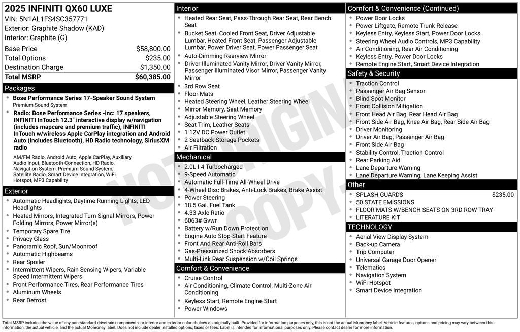 Bruce Bennett Nissan INFINITI of Danbury is proud to present you with another True Market Priced Vehicle. This 2025 INFINITI QX60 LUXE is loaded with the following Factory Options: 3rd row seats: bench, 4-Wheel Disc Brakes, ABS brakes, Air Conditioning, Alloy wheels, AM/FM radio: SiriusXM, Auto High-beam Headlights, Auto tilt-away steering wheel, Auto-dimming Rear-View mirror, Automatic temperature control, Brake assist, Delay-off headlights, Driver door bin, Driver vanity mirror, Dual front impact airbags, Dual front side impact airbags, Electronic Stability Control, Exterior Parking Camera Rear, Four wheel independent suspension, Front anti-roll bar, Front Bucket Seats, Front dual zone A/C, Front reading lights, Fully automatic headlights, Garage door transmitter: HomeLink, Heated door mirrors, Heated front seats, Heated rear seats, Heated steering wheel, Illuminated entry, Knee airbag, Leather Shift Knob, Leather steering wheel, Leather-Appointed Seating Surfaces, Low tire pressure warning, Memory seat, Navigation system: INFINITI InTouch Navigation, Occupant sensing airbag, Outside temperature display, Overhead airbag, Overhead console, Panic alarm, Passenger door bin, Passenger vanity mirror, Power door mirrors, Power driver seat, Power Liftgate, Power moonroof, Power passenger seat, Power steering, Power windows, Radio data system, Rain sensing wipers, Rear air conditioning, Rear anti-roll bar, Rear reading lights, Rear side impact airbag, Rear window defroster, Rear window wiper, Reclining 3rd row seat, Remote keyless entry, Security system, Speed control, Speed-sensing steering, Speed-Sensitive Wipers, Split folding rear seat, Spoiler, Steering wheel memory, Steering wheel mounted audio controls, Tachometer, Telescoping steering wheel, Tilt steering wheel, Traction control, Trip computer, Turn signal indicator mirrors, and Variably intermittent wipers!!
