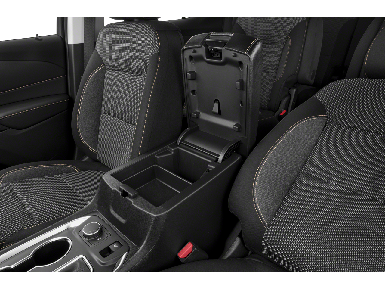 - Console, front center with 2 cup holders, covered storage bin with storage and removable tray