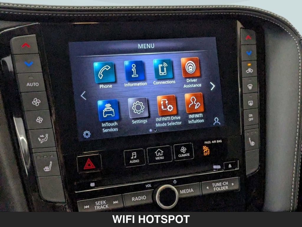 - Radio: HD Audio System -inc: INFINITI InTouch, INFINITI InTouch services, INFINITI InTouch dual display system w/upper 8" and lower 7" HD touch screens, wireless Apple CarPlay, Android Auto, HD radio technology, SiriusXM radio w/advanced audio features and 90-day complimentary trial, INFINITI voice recognition, Siri Eyes Free, Wi-Fi hotspot and active noise cancellation